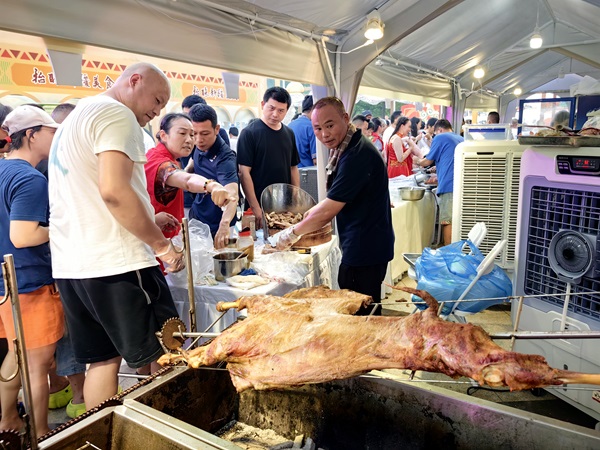 记者看到,在市集里,一边是芬芳飘香的周浦羊肉;另一边莎车烤全羊在烟熏火燎中抓人眼球。一些市民品味着不同风味的羊肉,再配上一杯冰果汁或冰啤,酷暑天里大快朵颐。