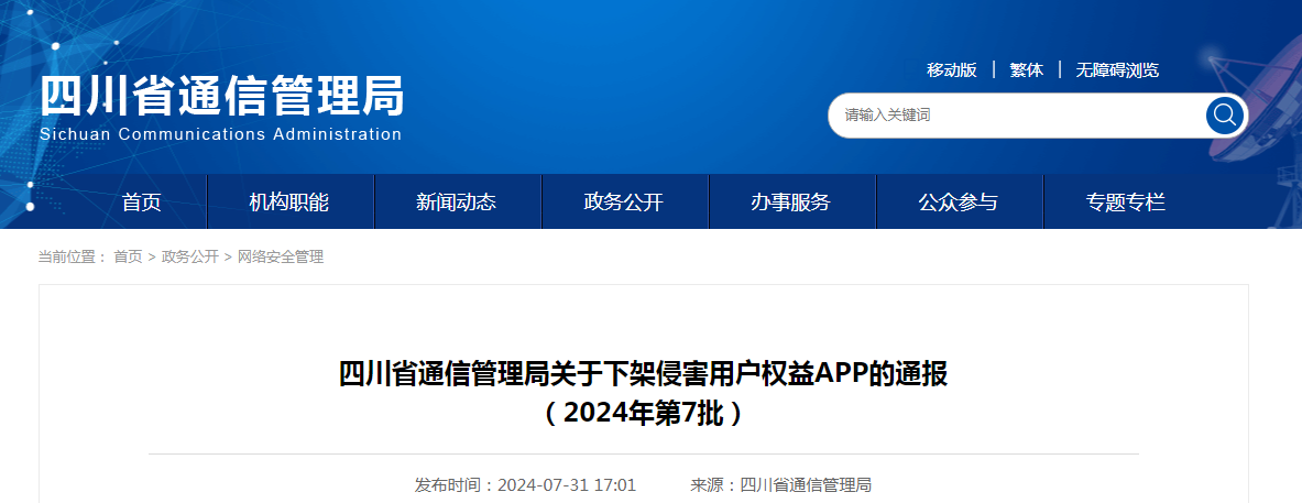 四川省通信管理局关于下架侵害用户权益APP的通报(2024年第7批)