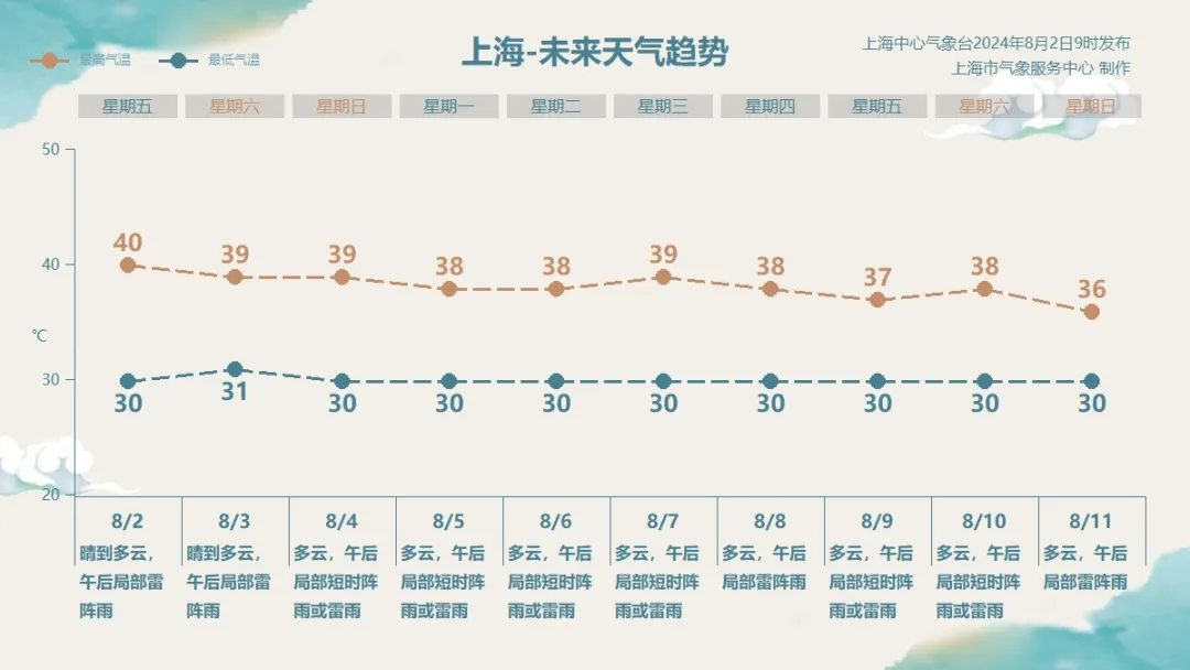 双休日上海持续高温酷热天气,最高气温依旧在40℃上下,注意防暑!下周后期,副热带高压稍有减弱,降水的可能性增加,但气温依然居高不下,极端最高气温仍有39℃。这轮高温是场持久战,防暑降温万万不能松懈。