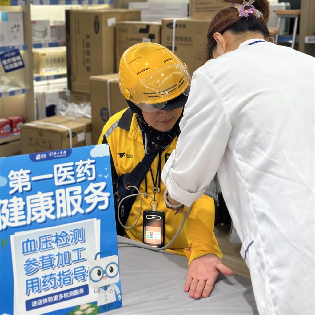 记者在位于上海徐汇区的第一医药门店看到,店内设有菊花茶等养生茶饮专区,可供外卖骑手免费取用。此外,在为骑手准备的防暑物资包里,装有藿香正气水、抗病毒颗粒等夏季常用药品。“如果外卖小哥感觉身体不舒服,可以进店纳凉,享受免费测血压等健康自测项目。”上海第一医药相关负责人介绍到。