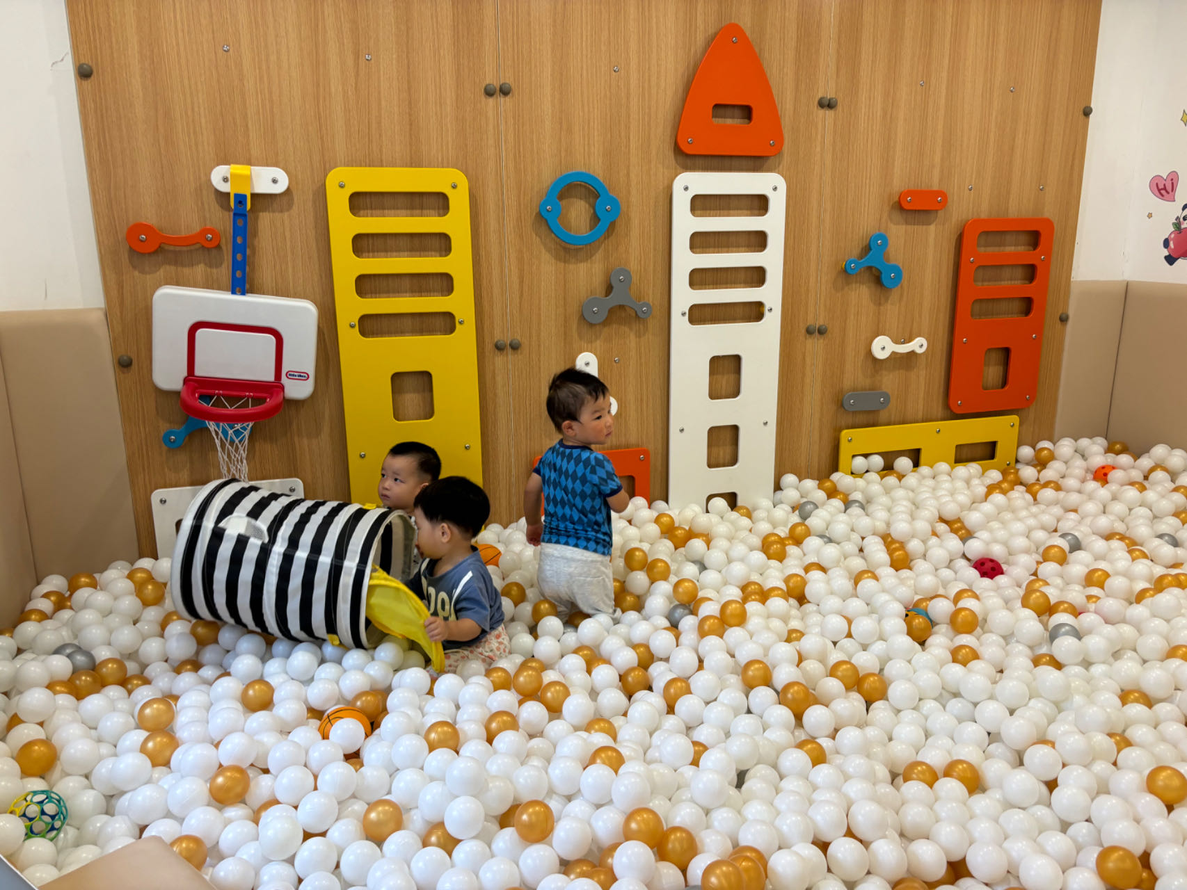 “宝宝屋”室内两间教室分为“融融活动馆”和“暖暖活动馆”,为孩子创设了适宜的运动、游戏和生活区域。
