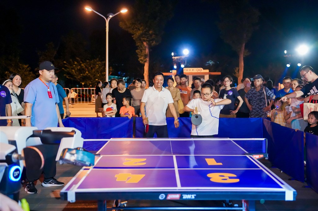 活动现场,一场别开生面的“人机大战”成为了全场焦点。来自菊园新区的小朋友马宇斐与他的父亲,正与一台名为庞伯特的乒乓球机器人展开激烈对决。这台运用了5G和人工智能技术的“庞教练”,以其精准的发球和多变的球路,让马宇斐在几个回合后便显得有些应接不暇,满头大汗的他直呼:“没想到机器人那么牛!”而马爸爸则迅速进入状态,侧切、扣杀等精彩动作频频出现,引来围观群众的阵阵掌声,将比赛推向了高潮。马爸爸兴奋地说:“感觉自己也像参加了一次奥运会比赛,有趣,好玩,畅爽!” 此外,活动还吸引了众多像林先生这样的乒乓球爱好者。林先生平时多以打羽毛球为主,但看到家门口的乒乓球比赛,他毫不犹豫地加入其中,尝试挑战自我。“最近在家天天看奥运,中国选手的勇于拼搏让我深受感动。所以家门口的运动会我必须要来参与一下,就当是我超越自己吧。”林先生如是说。