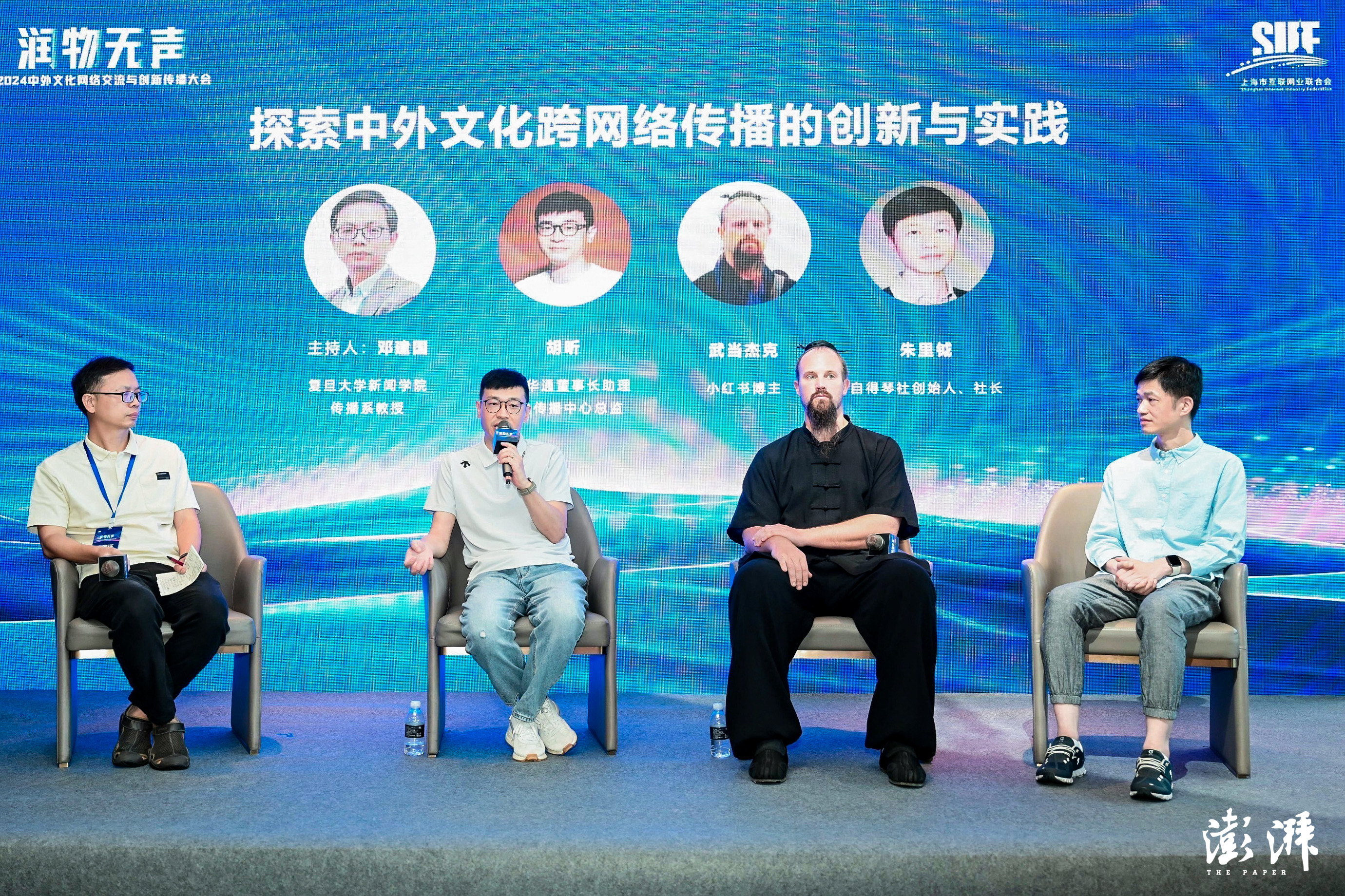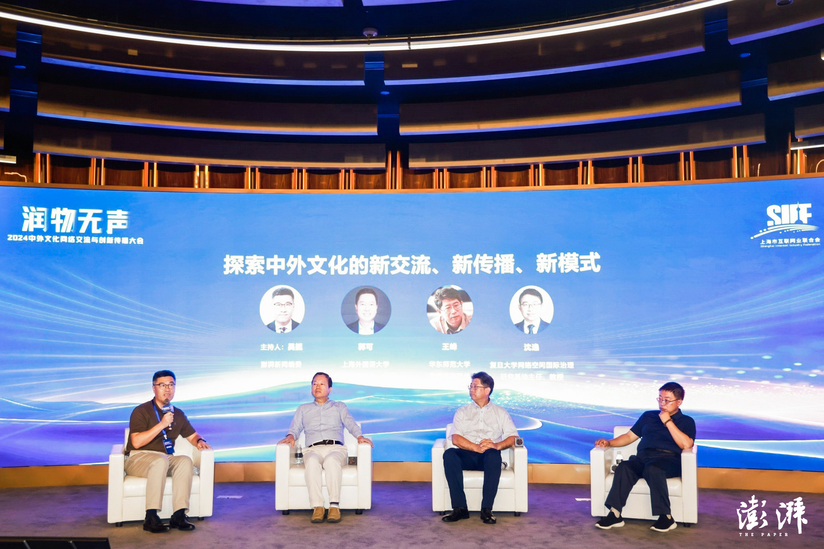 由澎湃新闻编委吴挺主持的第一个平行圆桌主题为“中外文化的新交流、新传播、新模式”。上海外国语大学新闻学院院长、教授郭可,华东师范大学新闻学院院长、教授王峰,复旦大学网络空间国际治理研究基地主任、教授沈逸分别从网络跨文化传播趋势、AI时代下的跨文化等角度发表开题演讲,并进行圆桌讨论。