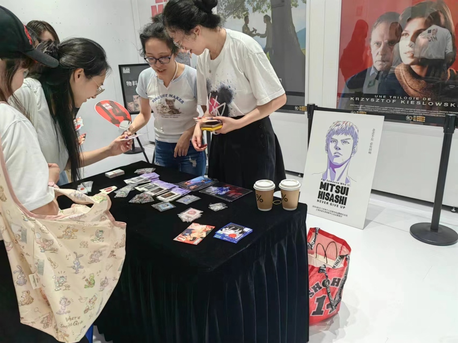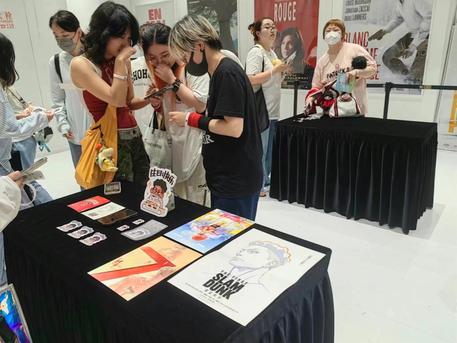 8月3日,上海影城SHO又成为《灌篮高手》的海洋。影院标志性天幕显示着《灌篮高手》巨幅海报,不时有手持周边、穿着各色球衣的观众在天幕前打卡合影,挥舞复刻电影中“炎之男”等各色“战旗”的粉丝引来同好围观。一楼曾用来做小型展览的场地变为临时小型“集市”,各种摊位上摆着粉丝自制的胸章、卡片、海报等。这些非营利的二创制品吸引同好交流,记者刚踏入其间,就被一位热情粉丝塞了一张免费的自制宫城良田二创明信片。
