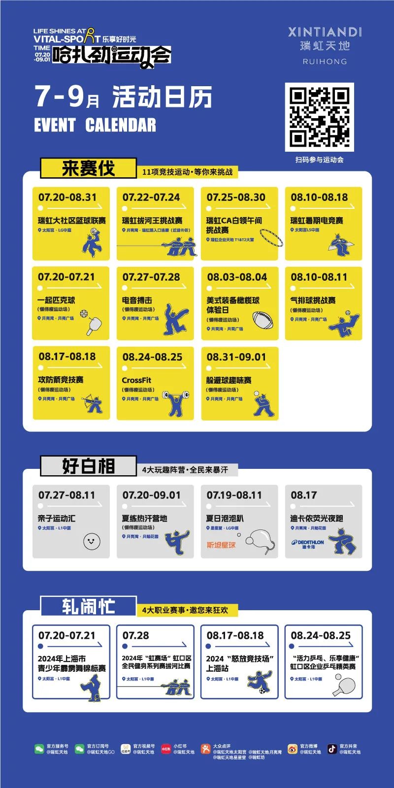 瑞虹天地首届哈扎劲运动会于上周开启,本次主题活动将打造长达6周属于阿拉自己的“奥运会”,贯穿瑞虹天地商圈,通过“来赛伐”“好白相”“轧闹忙”三大板块串联11项竞技运动、10项亲子打榜、12场暴汗热练、4大官方赛事,共计超40场运动赛事及体验。