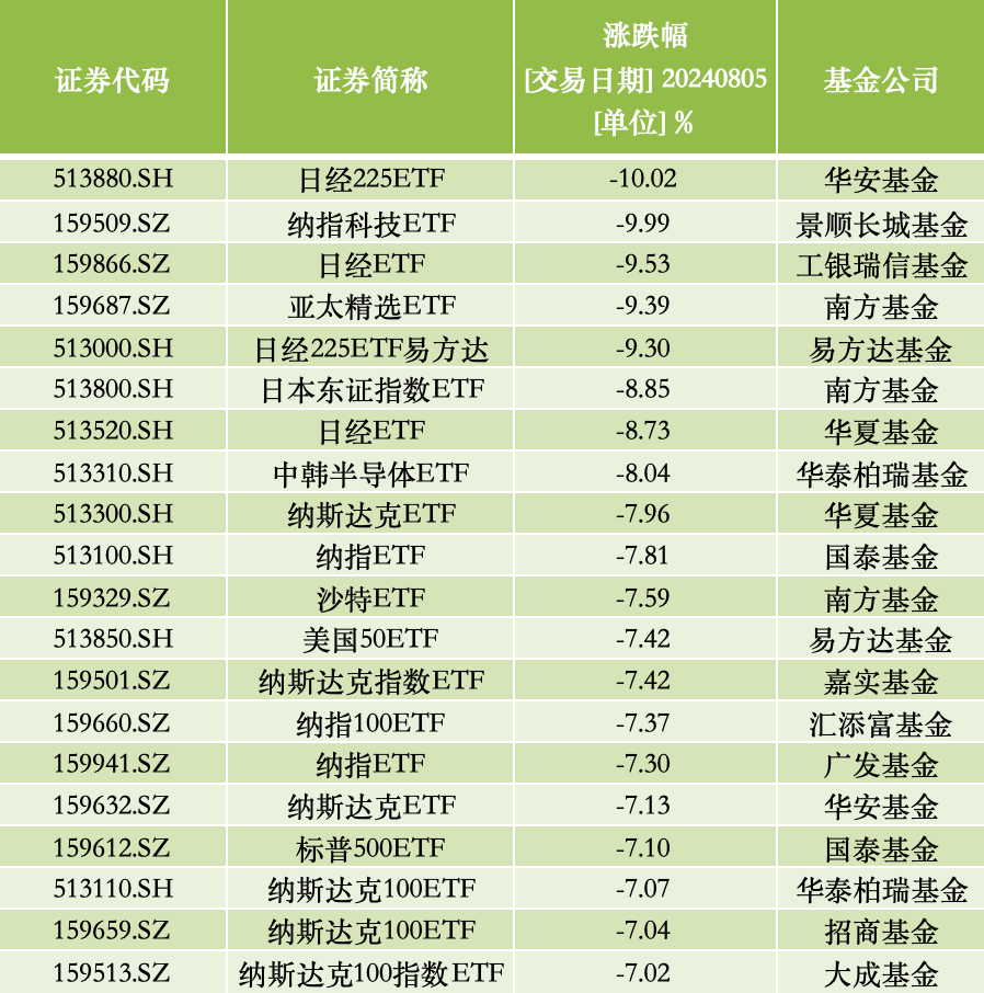 映射到国内市场,受外围股市暴跌影响,周一(8月5日)跨境ETF持续下挫。截至8月5日收盘,Wind数据显示,全市场128只跨境ETF中,127只收跌,剩余1只平盘。
