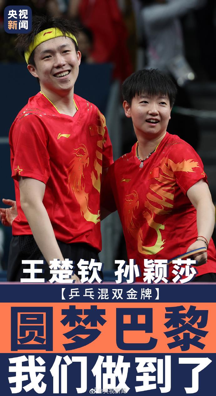 7月30日,在巴黎奥运会乒乓球混合双打决赛中,中国组合王楚钦/孙颖莎4-2战胜朝鲜组合,夺得金牌。“我们做到了!”东京的遗憾在巴黎画上了一个圆满的句号!