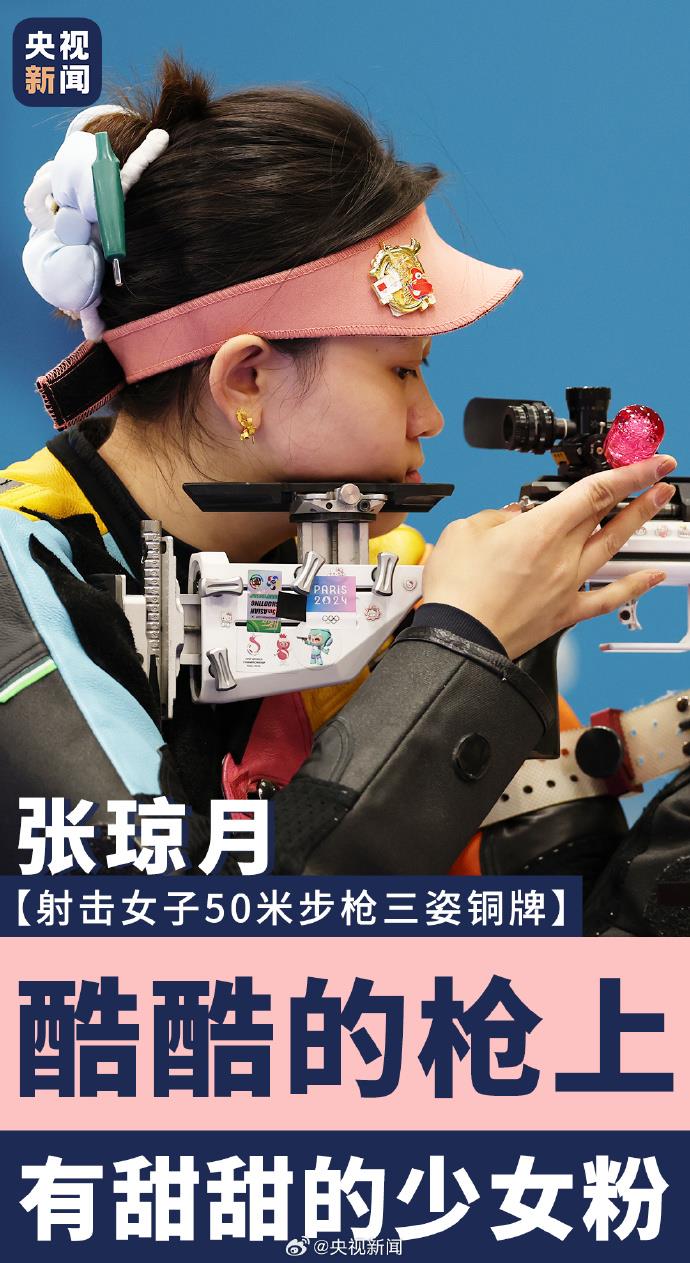 8月2日,在巴黎奥运会射击女子50米步枪三姿决赛中,中国选手张琼月夺得铜牌。戴着粉色帽子的张琼月,步枪上贴满可爱的Hello Kitty贴纸,用最萌的装备打最稳的枪!