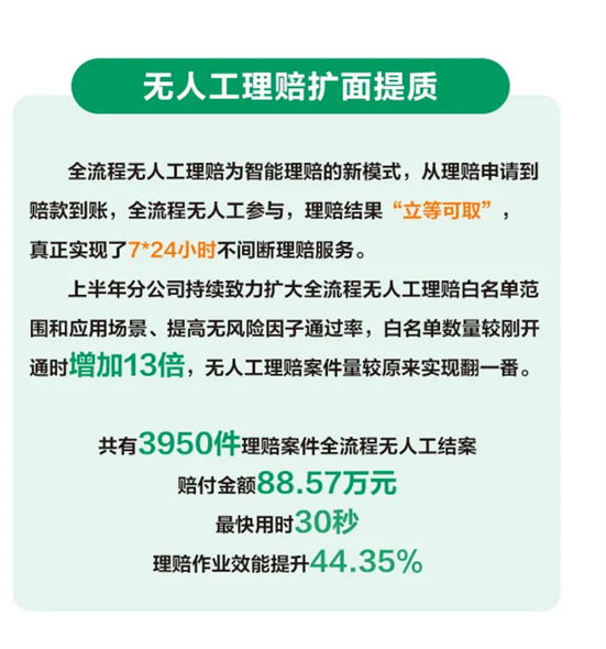 中国人寿寿险上海市分公司2024年上半年理赔服务报告显示,共有3950件理赔案件全流程无人工结案,最快用时30秒,理赔作业效能提升44.35%。