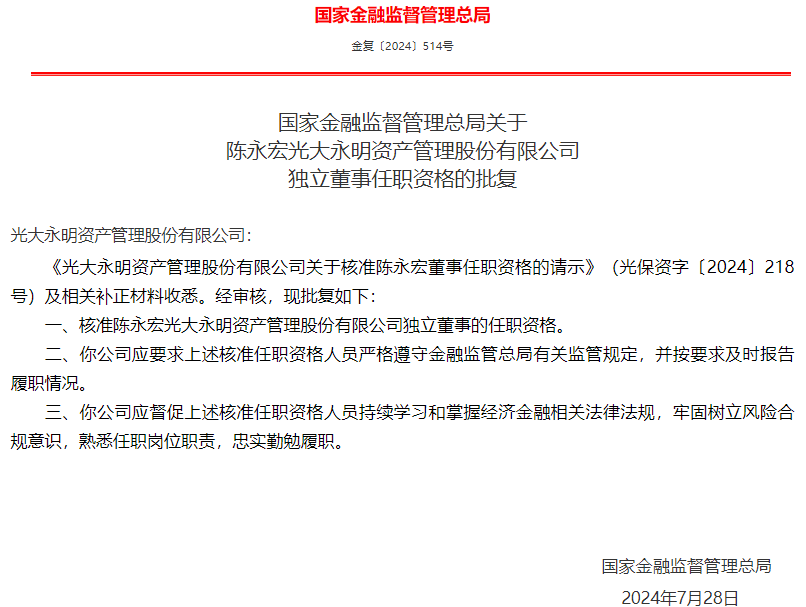 陈永宏获批出任光大永明资管独立董事