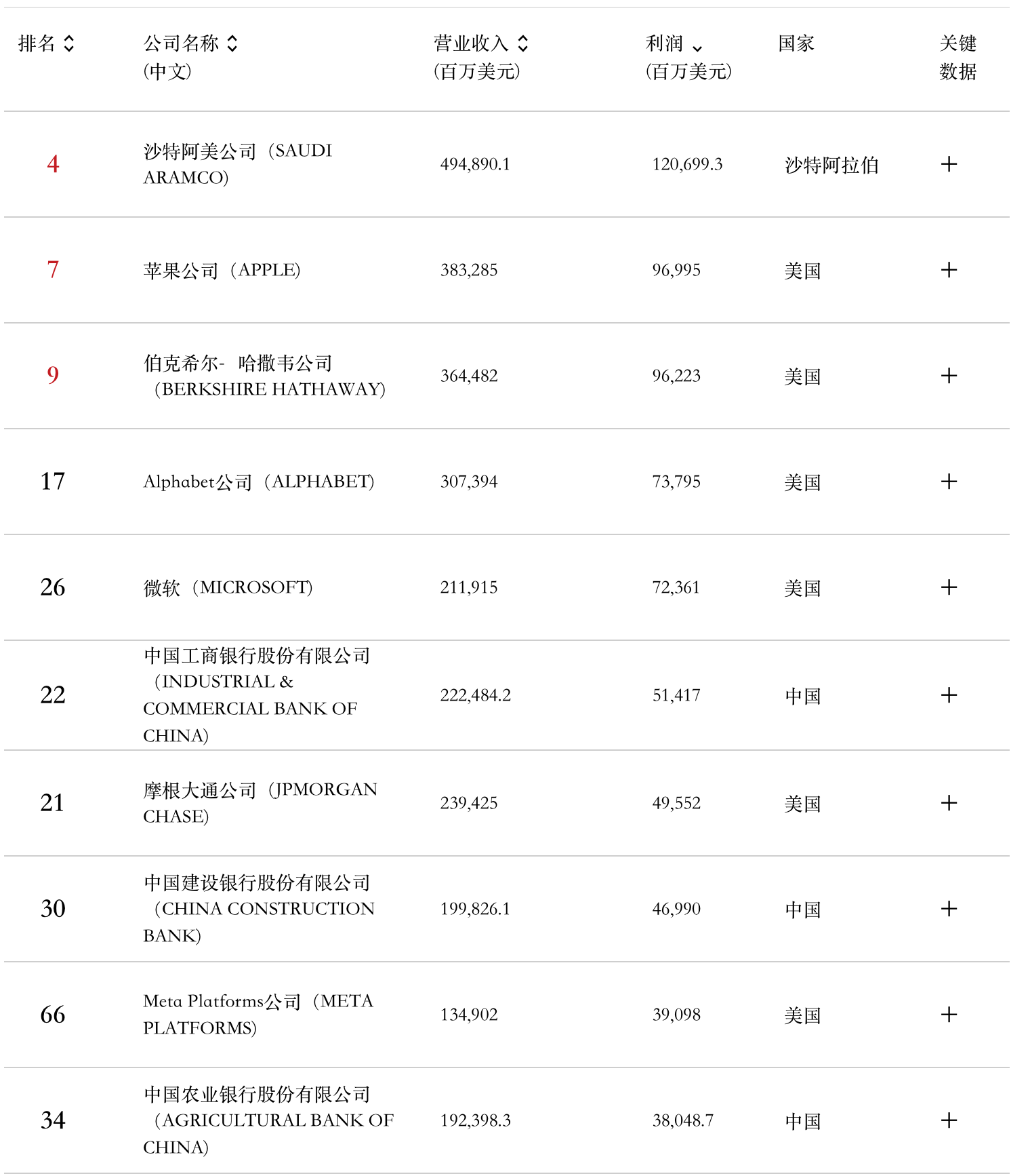 按照利润计算,沙特阿美是最为赚钱企业,利润为1206.99亿美元,苹果位列第二,伯克希尔位列第三,第4-10名分别为谷歌母公司Alphabet、微软、中国工商银行、摩根大通、中国建行、Meta以及中国农行。