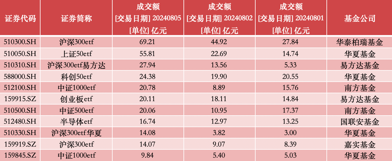 Wind数据统计,截至8月5日收盘,4只沪深300ETF午后显著放量,其中华泰柏瑞沪深300ETF、易方达沪深300ETF、华夏沪深300ETF、嘉实沪深300ETF的成交额均已超越上周五全天,依次为69.21亿元、27.94亿元、14.08亿元、14.07亿元。