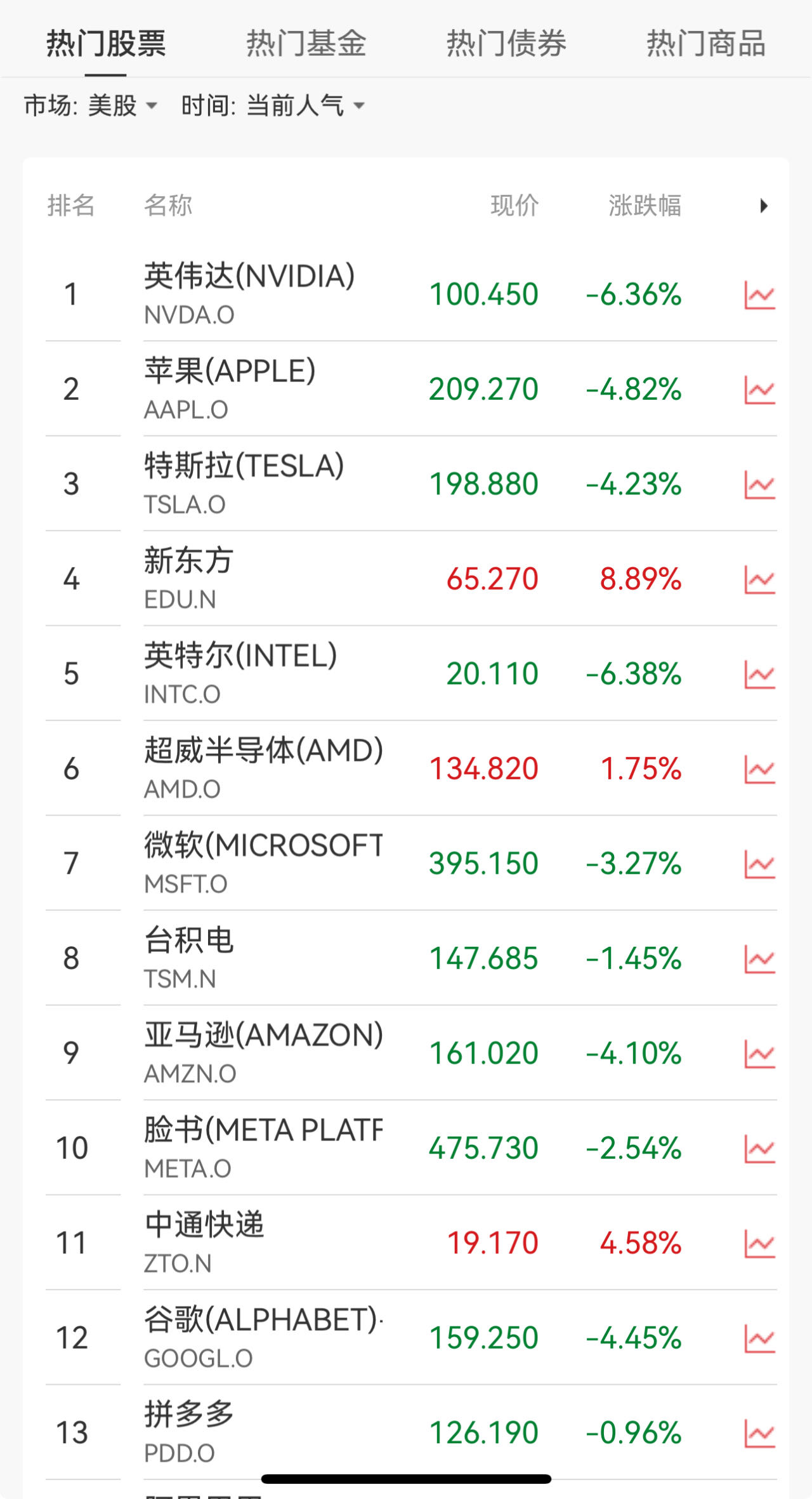 芯片股多数下跌,英特尔下跌6.38%,英伟达下跌6.36%,美光科技下跌2.46%,微芯科技下跌2.08%,台积电下跌1.45%,博通下跌1.21%,高通下跌0.85%,阿斯麦上涨1.36%,超威半导体上涨1.75%。