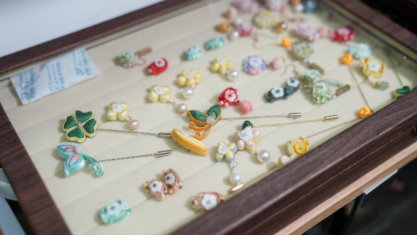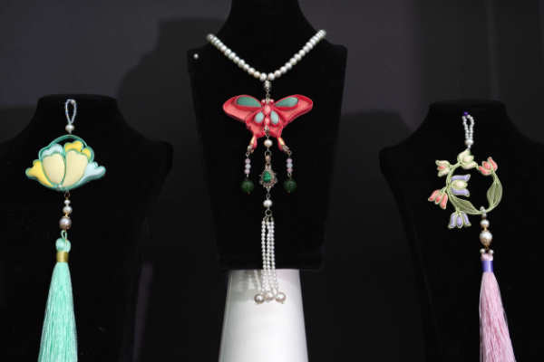 李嫱有一间近40平方米的工作室,各式各样的盘扣随处可见。经过设计赋能,它们不再依附于旗袍,而是有了独立、多样的形态——不论是吊坠、耳饰、胸针等饰品,还是扇面、画作等工艺品,都因盘扣的存在更具韵味。