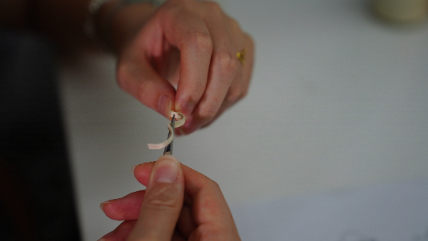 为了钻研学习盘扣技艺,李嫱正式拜师于海派旗袍盘扣制作技艺代表性传承人刘秋雁,还将一头长发剪到最短。3年时间,她带着敬畏之心,从基础的打扣头开始学起。