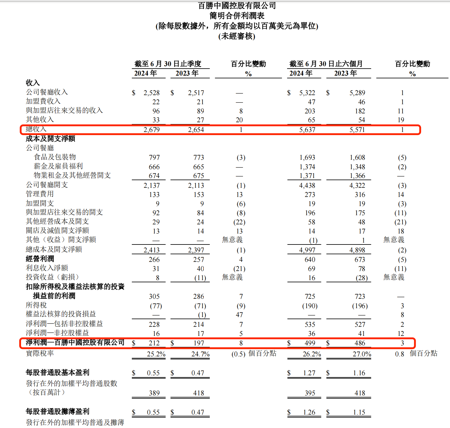 其中,二季度实现营收26.79亿美元,同比增长1%,若不计及外币影响总收入增长4%;净利润2.12亿美元,同比增长8%;经营利润则实现4%的增长至2.66亿美元。2024年上半年百胜中国实现营收56.37亿美元,同比增长1%;经营利润同比下降5%至6.4亿美元;实现利润4.99亿美元,同比增长3%。
