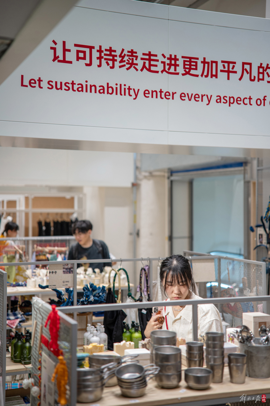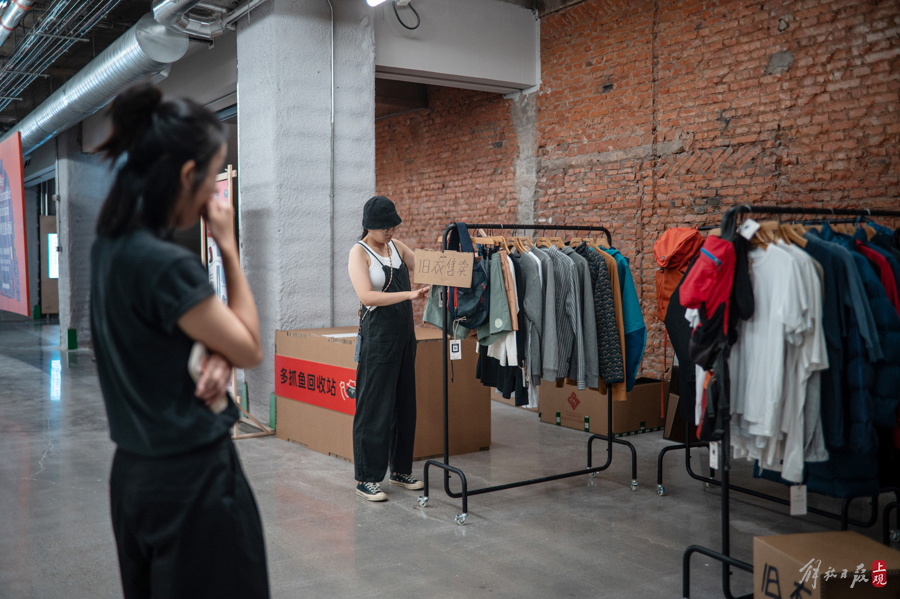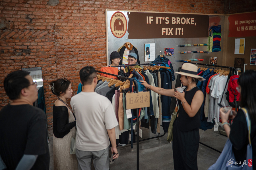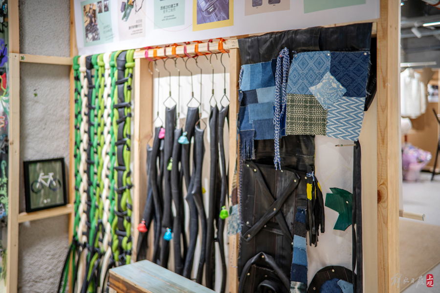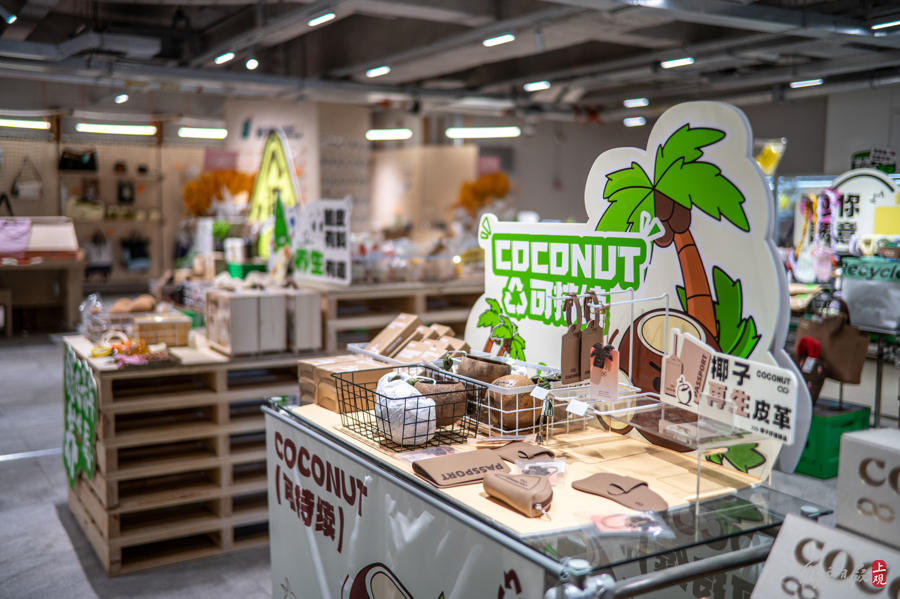 从轮胎内胎做的时尚挎包,到椰子壳再生皮革的制品,再到一楼由循环再生品牌多抓鱼和户外品牌巴塔哥尼亚合作设立的服装现场修复摊位,都让环保与惜物变为了一件最时髦的事。
