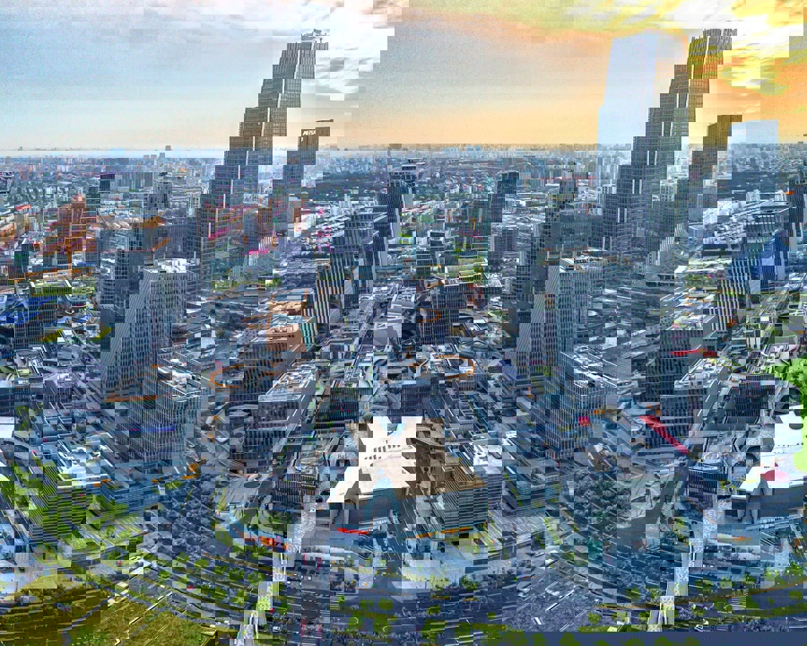 造型宛如裙摆的西岸智塔及裙楼商业西岸凤巢,图中最高楼为星扬西岸中心。