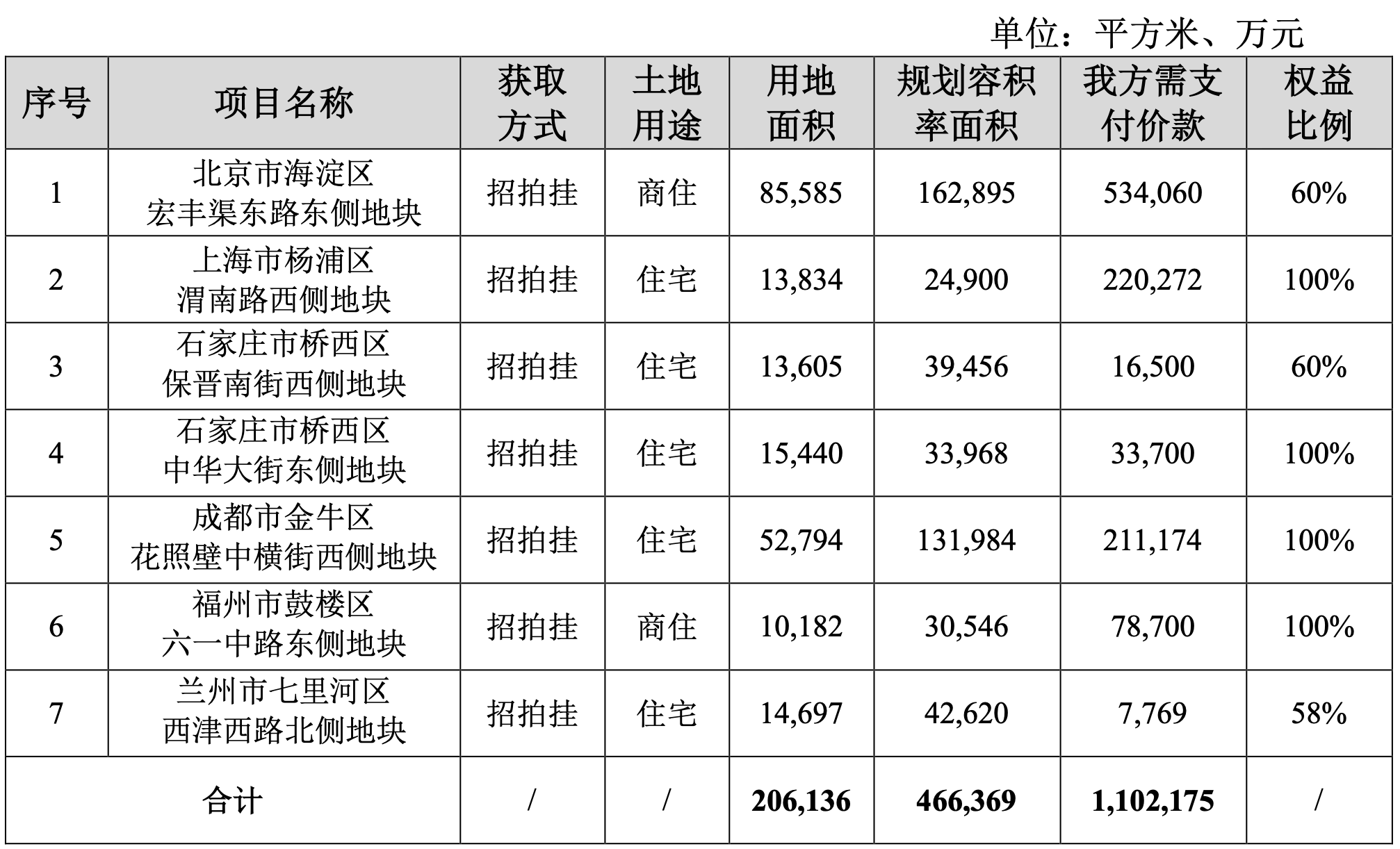7月,保利发展共计斥资110.2175亿元,新增加7个房地产项目 。7个项目分别位于北京、上海、石家庄(2个)、成都市、福州市以及兰州市,用地面积20.6136万平方米,规划计容面积46.6369万平方米。其中,上海市杨浦区渭南路西侧地块、石家庄市桥西区中华大街东侧地块、成都市金牛区花照壁中横街西侧地块和福州市鼓楼区六一中路东侧地块为保利发展持有100%权益,分别斥资22亿元、3.37亿元、21.1亿元和7.87亿元。北京市海淀区宏丰渠东路东侧地块权益占比60%,该地块由保利发展出资53.4亿元。
