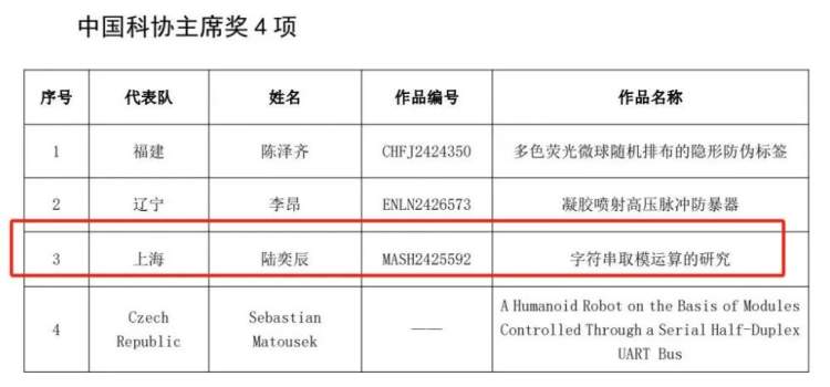 7月29日,以“勇担时代使命,助力高水平科技自立自强”为主题的第38届全国青少年科技创新大赛在天津梅江会展中心落幕。上海交通大学附属中学嘉定分校2025届英才班的陆奕辰同学以《字符串取模运算的研究》的课题斩获大赛一等奖、中国科协主席奖及专项奖筑梦航天创新创意奖。