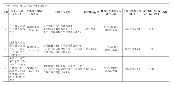 因可疑交易监测机制不完善,贵阳银行遵义分行被罚47万元