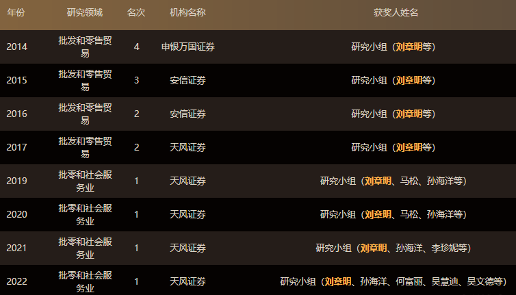 在研究领域,刘章明有“消费一哥”之称。新财富官网资料显示,在批发和零售贸易研究领域,刘章明已8次入选新财富最佳分析师。