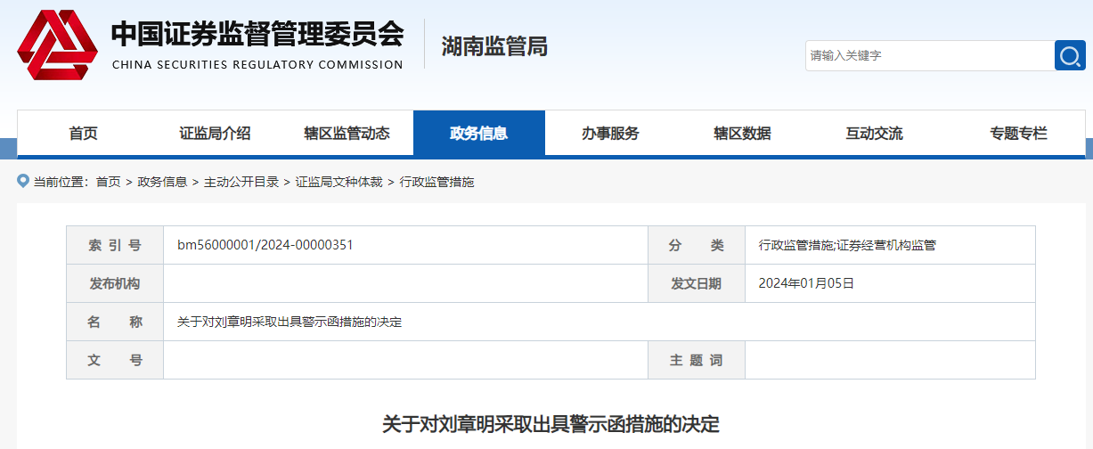 湖南证监局进一步指出,刘章明个人还存在向客户违规私自荐股的情形,决定对刘章明采取出具警示函的行政监管措施。