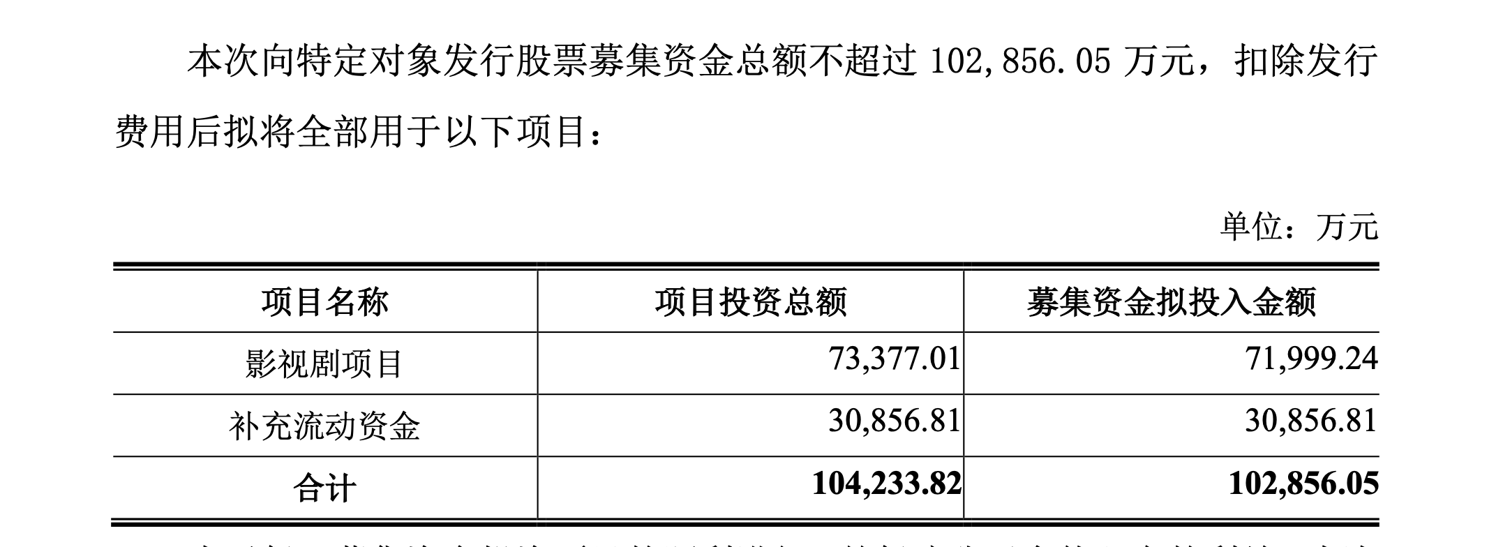 8月9日晚间,华谊兄弟传媒股份有限公司(华谊兄弟,300027)发布2024年度向特定对象发行股票募集资金使用可行性分析报告,拟向特定对象发行股票募资不超过约10.29亿元,扣除发行费用后,拟将全部费用用于影视剧项目、补充流动资金。