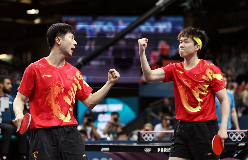 新华社照片,巴黎,2024年8月9日 8月9日,马龙/王楚钦(右)在比赛中庆祝得分。 当日,在巴黎奥运会乒乓球男团金牌赛中,中国队战胜瑞典队,获得冠军。 新华社记者 王东震 摄