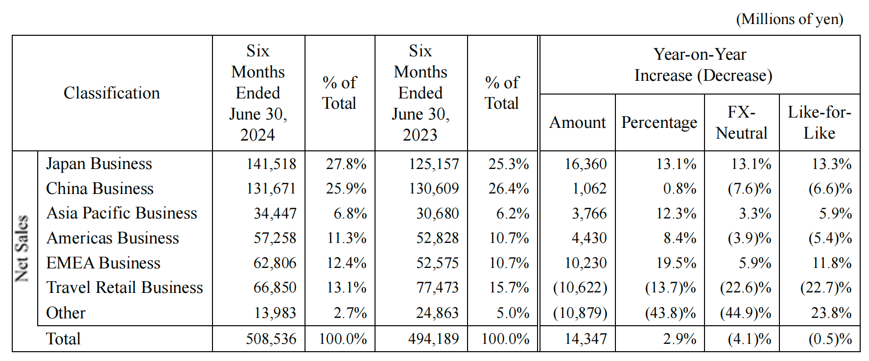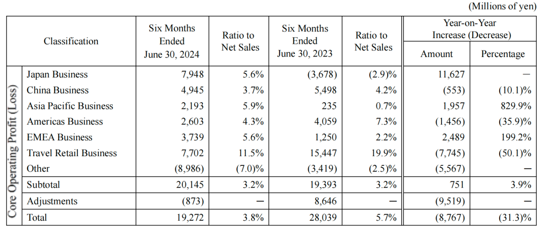 资生堂在财报中指出,中国市场依然受到核污水处理的持续影响,消费者减少了对日本产品的购买。同时资生堂在中国的业务发生了转型,由大规模促销驱动的增长模式转向更可持续的增长模式,对销售额造成了一定影响。旅游零售业务在不同地区受到了不同影响:在日本由于访日外国游客数量超过疫情前,旅游零售业务实现了强劲复苏。而在海南岛和韩国等地,由于中国游客购买行为的变化,出货量下降,销售额也受到了影响。