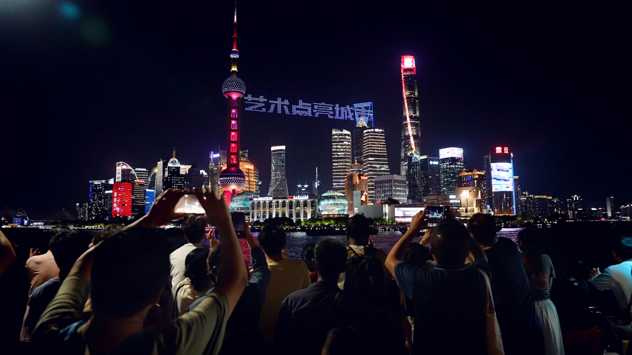 8月9日晚上,外滩黄浦江上空,一组无人机进行了飞行表演。空中依次出现“东方明珠”、“艺术点亮城市”等图案与文字,惊艳现场。许多市民、游客纷纷举起手机留下美好一刻。