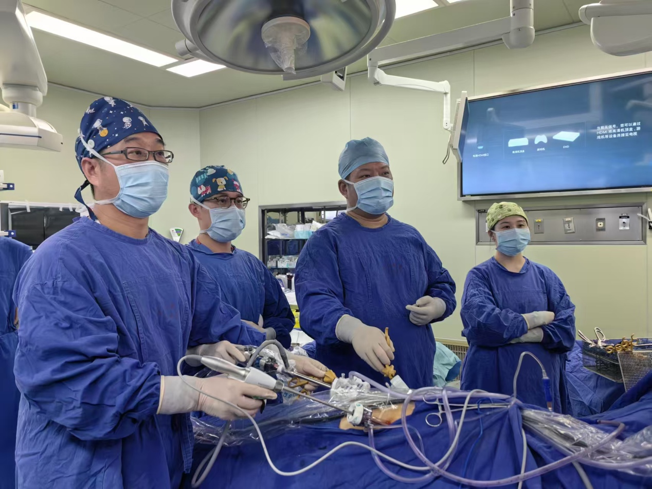 姜昊文带领熊祖泉、邹鲁佳一起完成腹腔镜肿瘤肾切除手术。