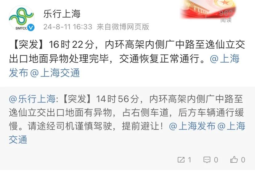 8月11日下午4时33分,@乐行上海 发布消息:16时22分,内环高架内侧广中路至逸仙立交出口地面异物处理完毕,交通恢复正常通行。