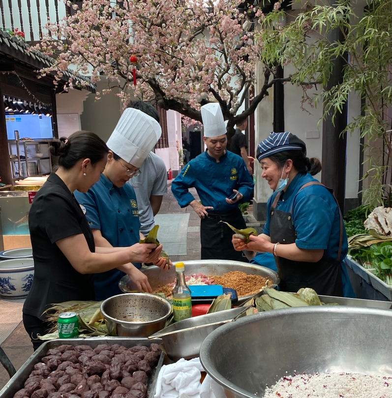 老城厢有家名牌饭店,火腿粽子遐迩闻名,才拇指大小,却有条不紊地箍了十三道红丝线。一个“福”字正好十三画,小粽子也叫“福粽”。据说出自附近弄堂一个阿婆之手,现在阿婆做不动了,但换作别人包,就少了点意思。