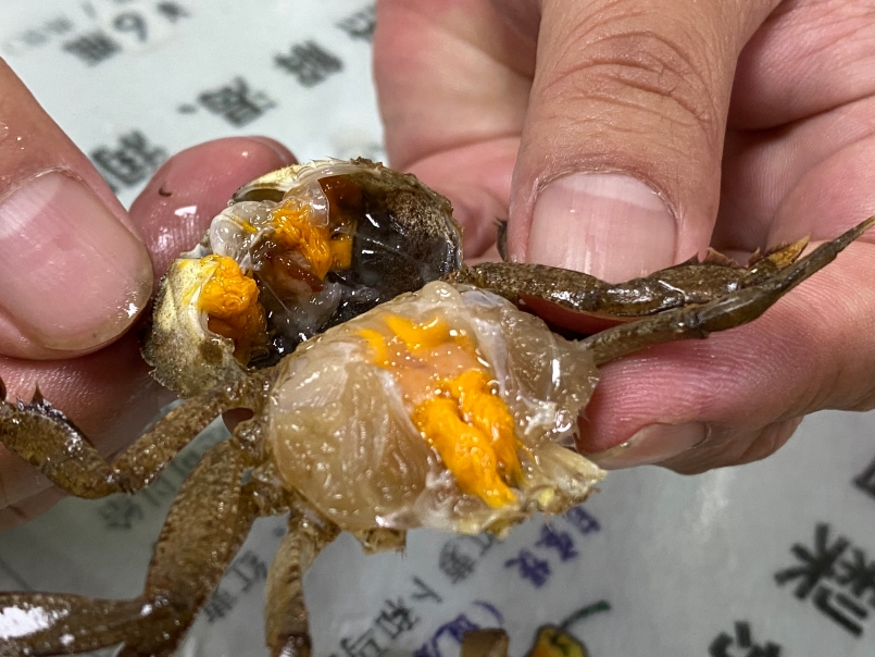 广东人采集蟛蜞籽蒸成膏或炒成松,置顶的,便叫“礼云子”。