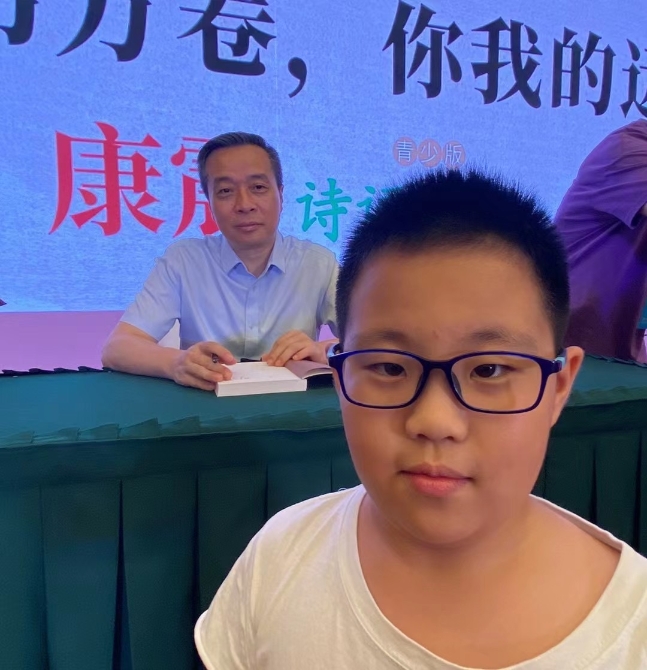 我们全家都是“中国诗词大会”节目的粉丝,耀耀尤其喜爱康震老师,对他渊博的历史人文知识和精湛的书画技艺很是崇拜。因此,当爸爸看到康老师要来上海书展举办读者见面会、签售新书的预告后,立马就把这个好消息告诉了耀耀。