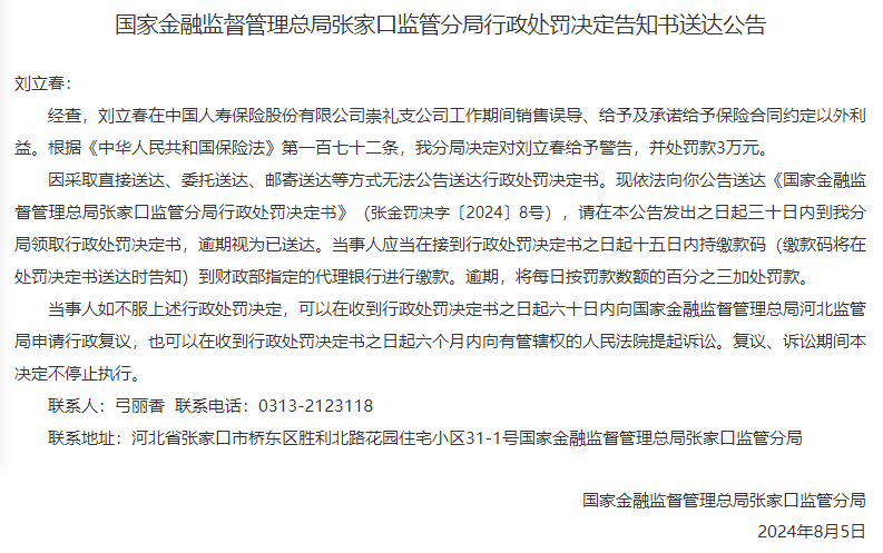 东方资讯消息,国家金融监督管理总局张家口监管分局行政处罚决定告知书送达公告显示,因工作期间销售误导、给予及承诺给予保险合同约定以外利益,对在中国人寿保险股份有限公司崇礼支公司工作的刘立春进行警告并处罚款3万元处罚。