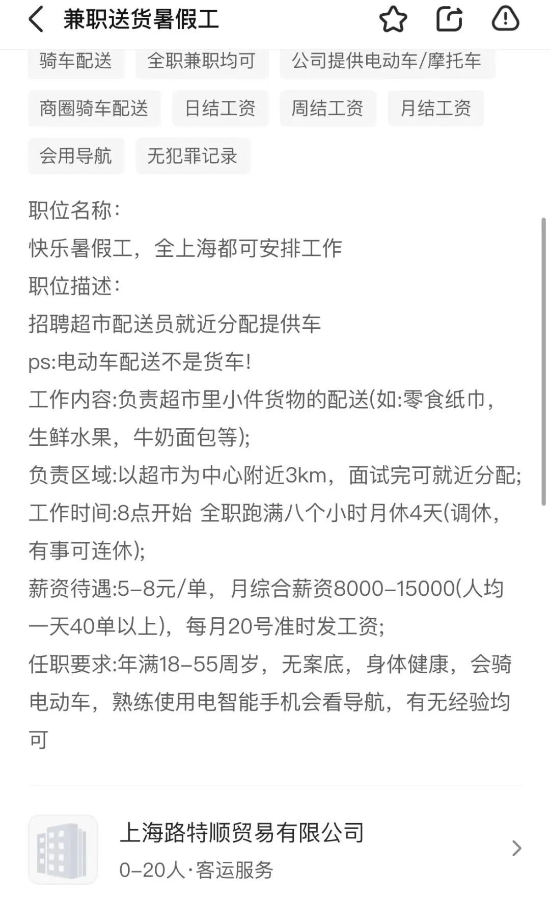 上班时间自由、外卖骑手免费使用电动车,还提供各类福利补贴、月薪8000到15000元……当心!别被网上这些招聘信息“迷了眼”。沪上多位大学生向“夏令热线·帮侬忙”求助,本想在暑假勤工俭学应聘兼职外卖骑手,谁知竟被“深深套”。