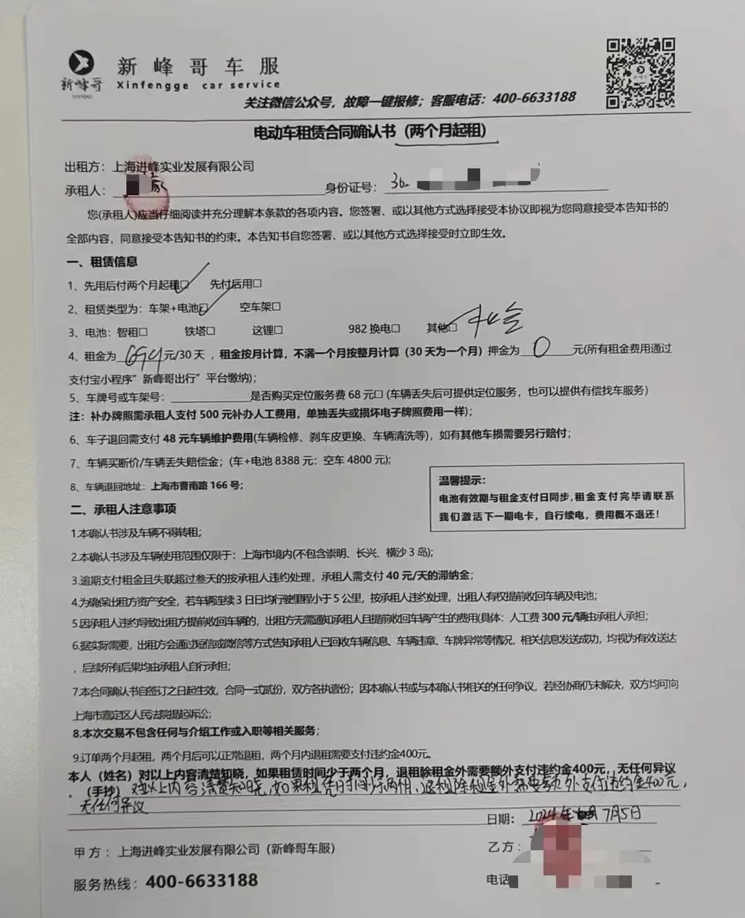 19岁的大学生小李反映,他于6月底看见一则招聘骑手信息。但自面试开始,就隐隐感觉不对劲:公司和地点与招聘信息说得完全不一样。面试时,工作人员并没过多介绍工作内容,只是强调会提供电动车,干满两个月能报销租车费699元。随后,让他签订了一份上海进峰实业发展有限公司的电瓶车租赁合同,“没给我纸质版的合同留底,而且上面也没有盖任何公章。”