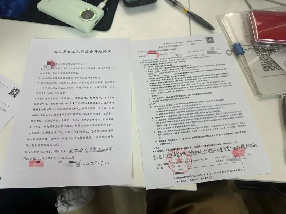 对方提出,电动车可以先用后付,每个月支付租金699元,头盔需要20元押金,归还后可以退还。离开时,帮忙君遇见一位大二学生刚签约入职。他坦言,之前面试过好多家招骑手的公司,运营模式都差不多,签协议提供租车服务。在帮忙君提醒下,他打开手机才意识到自己或许陷进了“分期租车陷阱”。