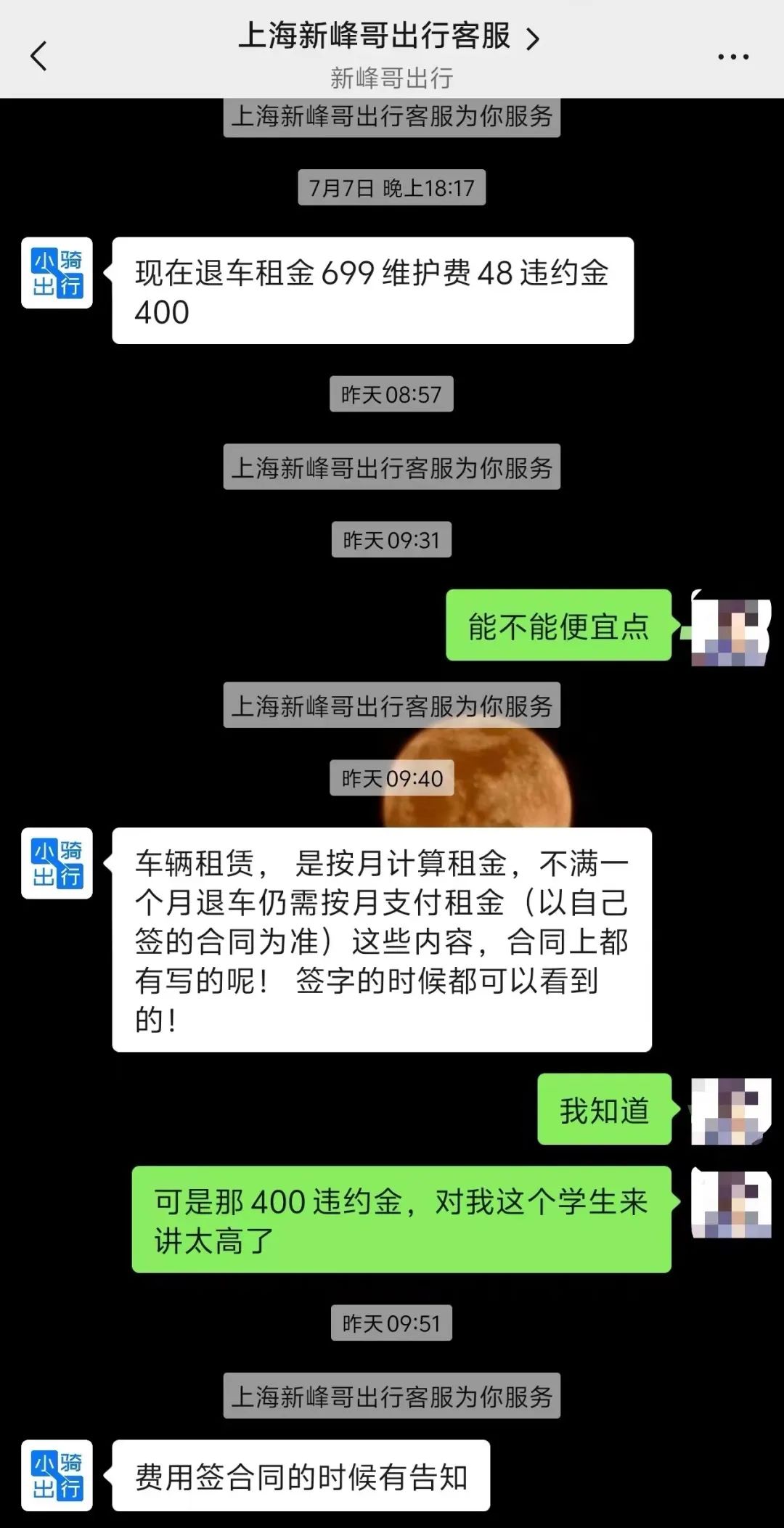 小李找到车行想要退车不做了,此时又被告知合同上写明租赁时间少于两个月,退租除租金外还要支付违约金,算下来总计1147元,“车行不给我解约,让我去找面试的公司解约,但那里又踢给车行。”