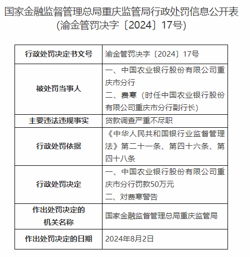 因贷款调查不到位,农业银行重庆市分行被罚50万元