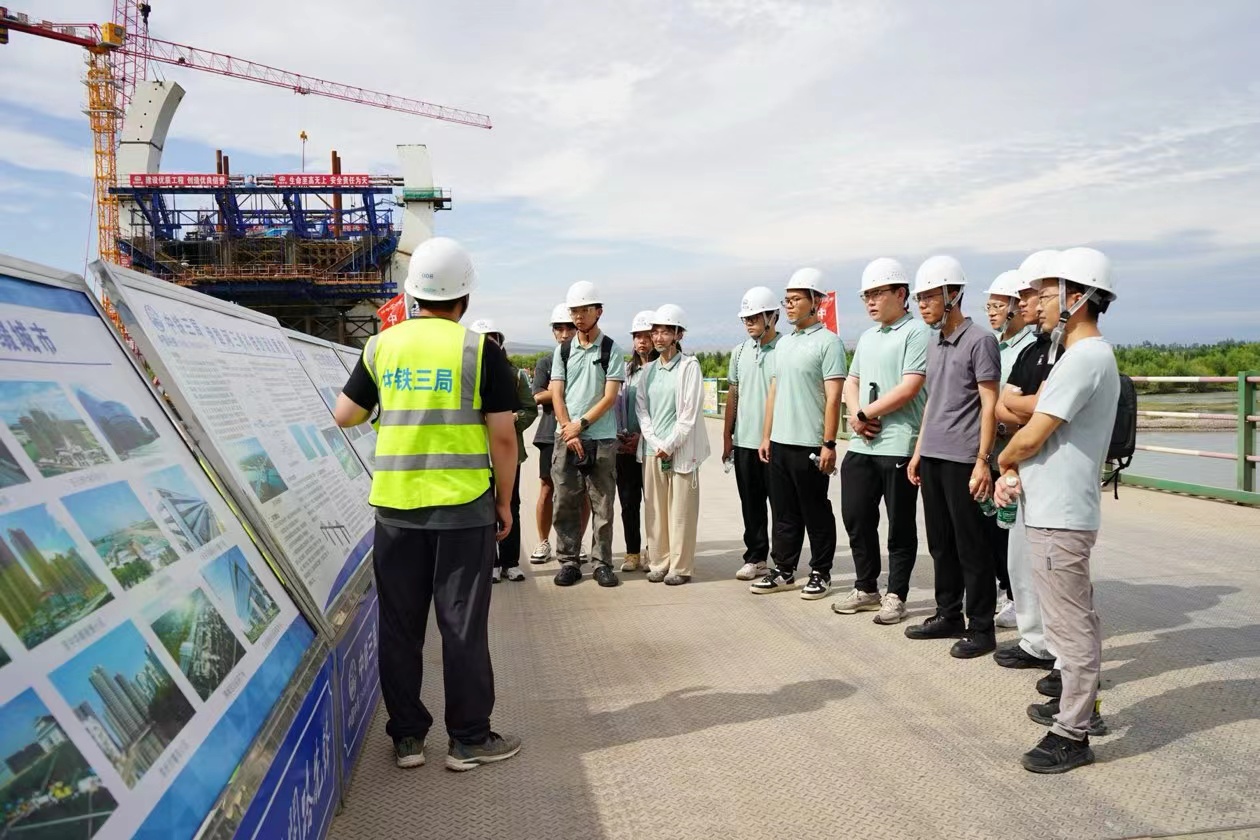伊犁河三桥施工现场总工给实践队伍介绍项目概括。李蕴海供图
