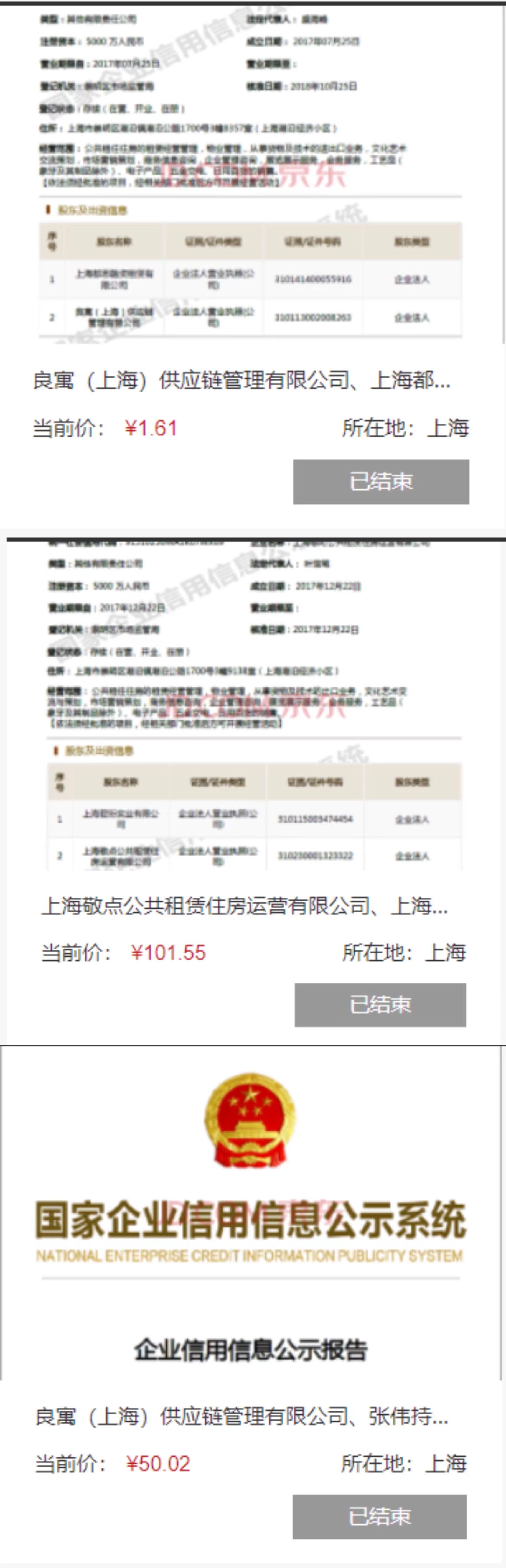 公开信息显示,2024年3月18日,西城区法院先后发布3条拍卖公告,内容分别为:关于良寓(上海)供应链管理有限公司、上海都思融资租赁有限公司持有的上海敬点公共租赁住房运营有限公司的全部股权(第一次拍卖)的公告;关于上海敬点公共租赁住房运营有限公司、上海君珩实业有限公司持有的上海敬珩公共租赁住房运营有限公司的全部股权(第一次拍卖)的公告;关于良寓(上海)供应链管理有限公司、张伟持有的上海大琚公共租赁住房运营有限公司的全部股权(第一次拍卖)的公告。