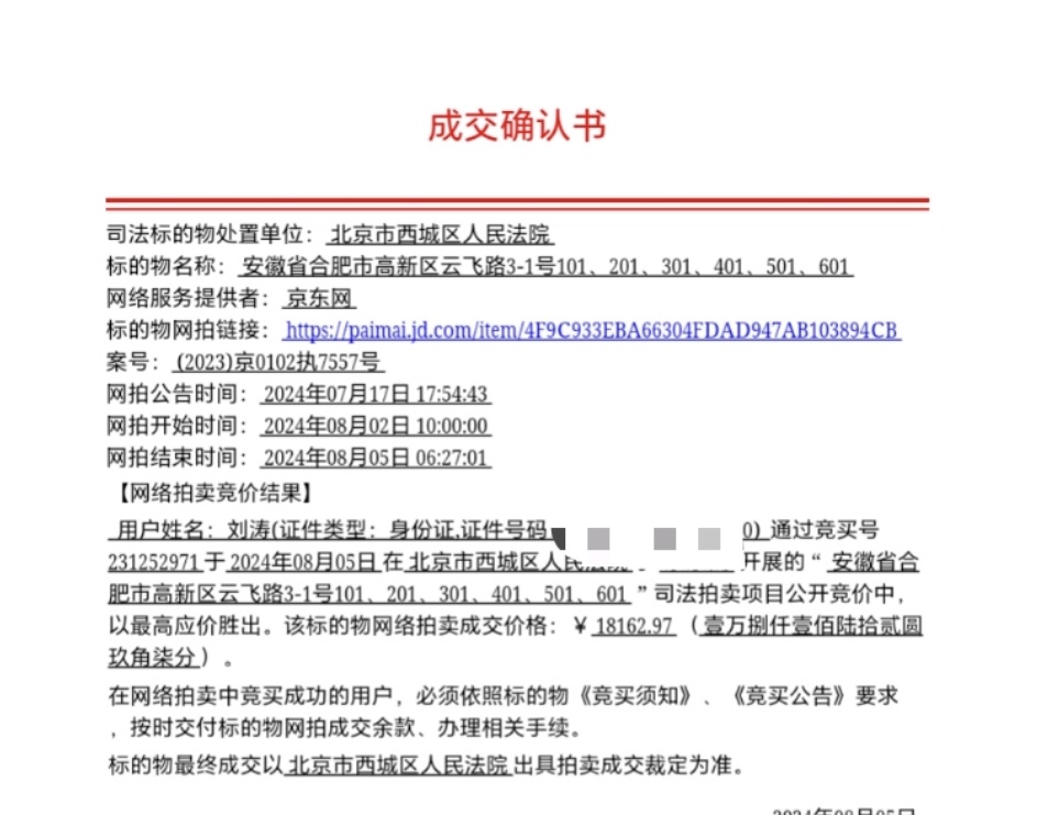 8月5日当天,刘涛拿到京东拍卖平台的《成交确认书》。《成交确认书》显示,标的物最终成交以北京市西城区人民法院出具拍卖成交裁定为准。