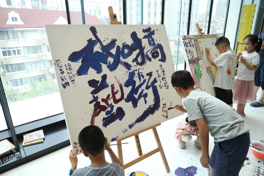 新华传媒连锁艺术顾问、青年艺术家万雨尘想做的是通过多元有趣的互动拓展大众对艺术的认知。从“艺术避风港”出发,在书城四楼,艺术家黄陵野鹤和张赢与读者共创“不如搞艺术”。张赢将自己创作的主人公“兮兮”安排成在正在看现场绘画的观众,当他画到一半,邀请现场读者参与作画,将自己的自画像画在“兮兮”正在观看的画作中,原来,这是一个跟现场环境同步互动的作品,读者在看张赢画画,张赢画的人在看着读者画的人。镜头往旁边移动一些,在这幅画旁,还有一幅露出一半的当代书法作品,黄陵野鹤用自创的当代字体写下对艺术的态度。