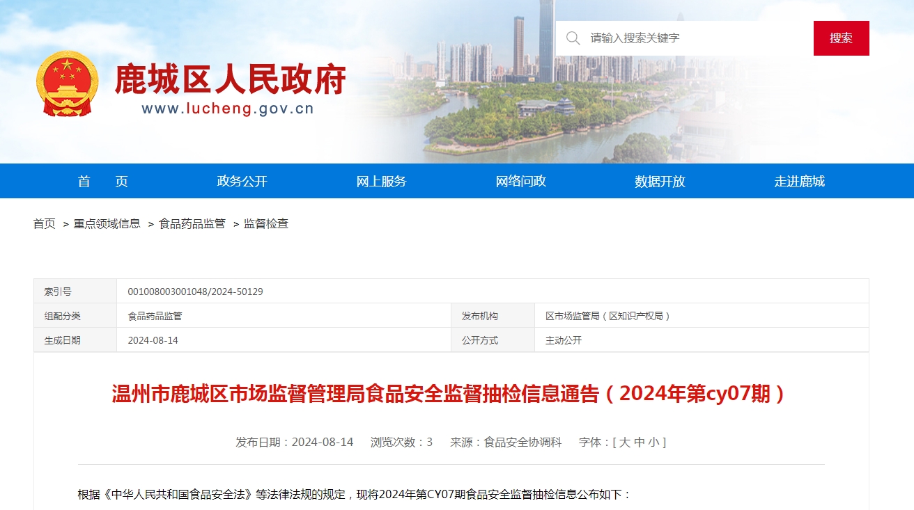 浙江省温州市鹿城区市场监督管理局食品安全监督抽检信息通告(2024年第cy07期)