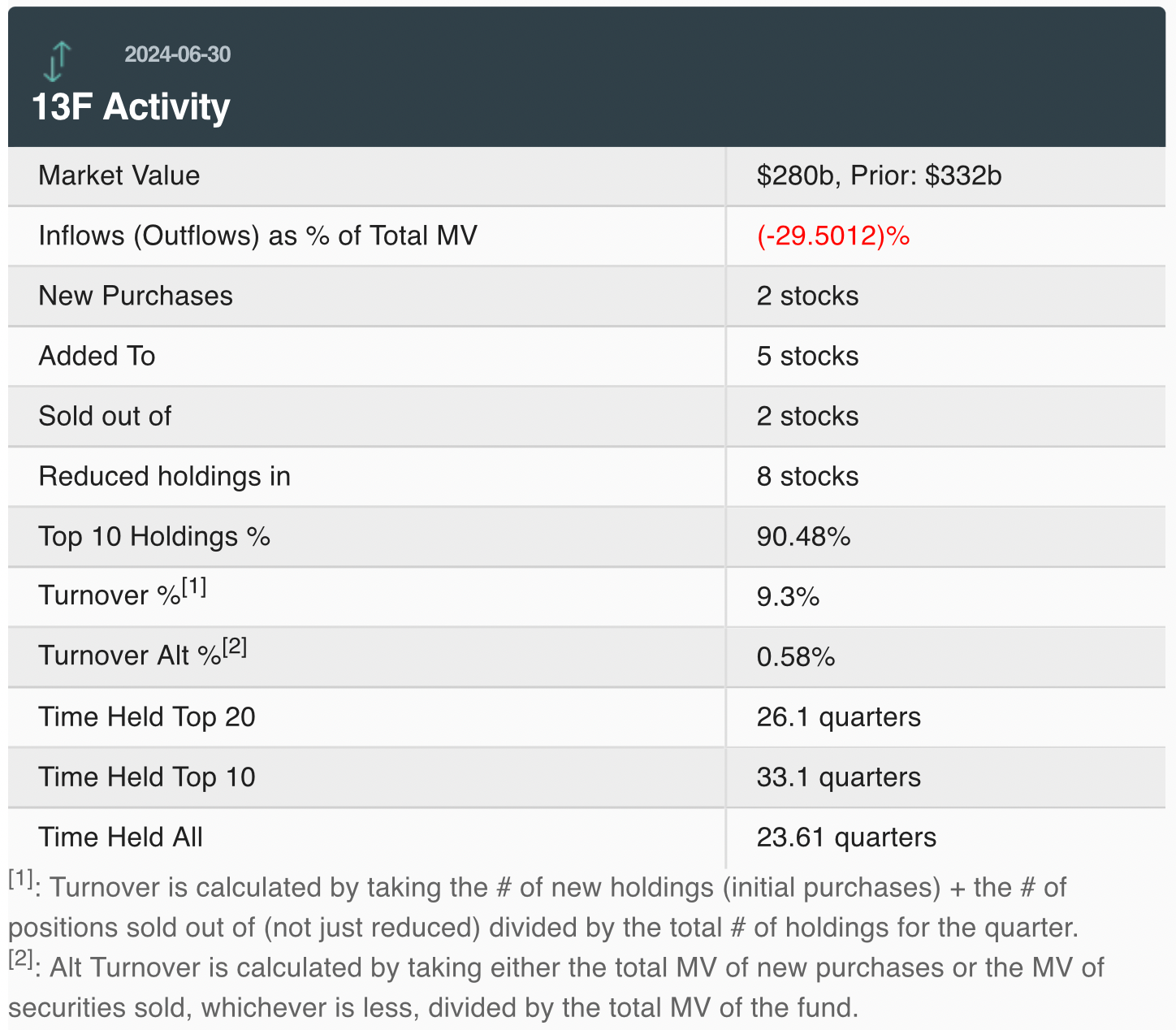 13F数据平台Whalewisdom统计显示,今年二季度,该公司共新进了2只股票,增持了5只股票,减持了8只股票,同时还清仓了2只股票。伯克希尔的持仓集中度则有所下降,前十大持仓股占总持仓比例由91.19%降至90.48%。