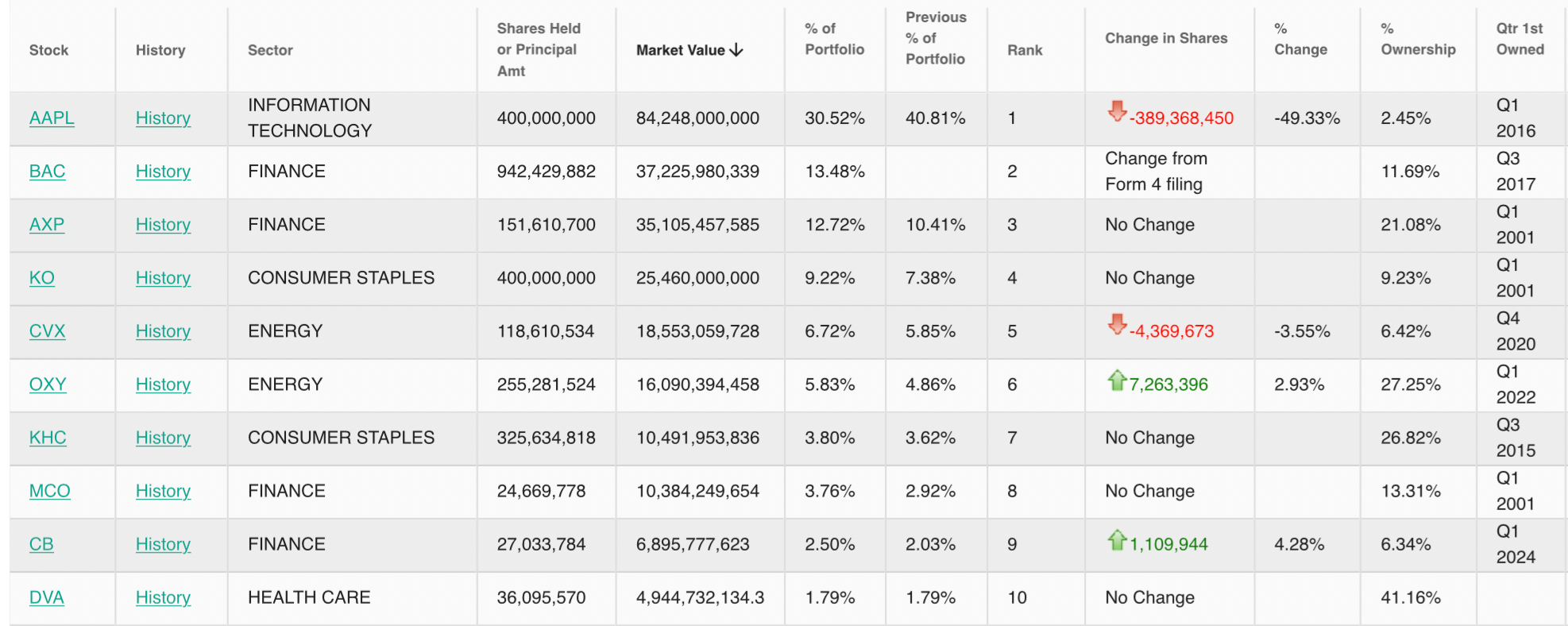 从这份13F表格可以看出,巴菲特继续从美股科技板块中大撤退,并加大了对能源、保险以及美妆领域的投资。截至二季度末,伯克希尔的前十大重仓分别为苹果、美国银行、美国运通、可口可乐、雪佛龙、西方石油、卡夫亨氏、穆迪、安达保险、达维塔保健。