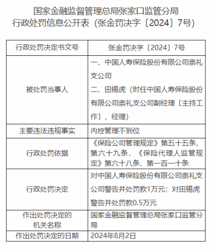 东方资讯消息,日前,国家金融监督管理总局张家口监管分局行政处罚信息公开表显示,因内控管理不到位,对中国人寿保险股份有限公司崇礼支公司进行警告并处罚款1万元处罚。